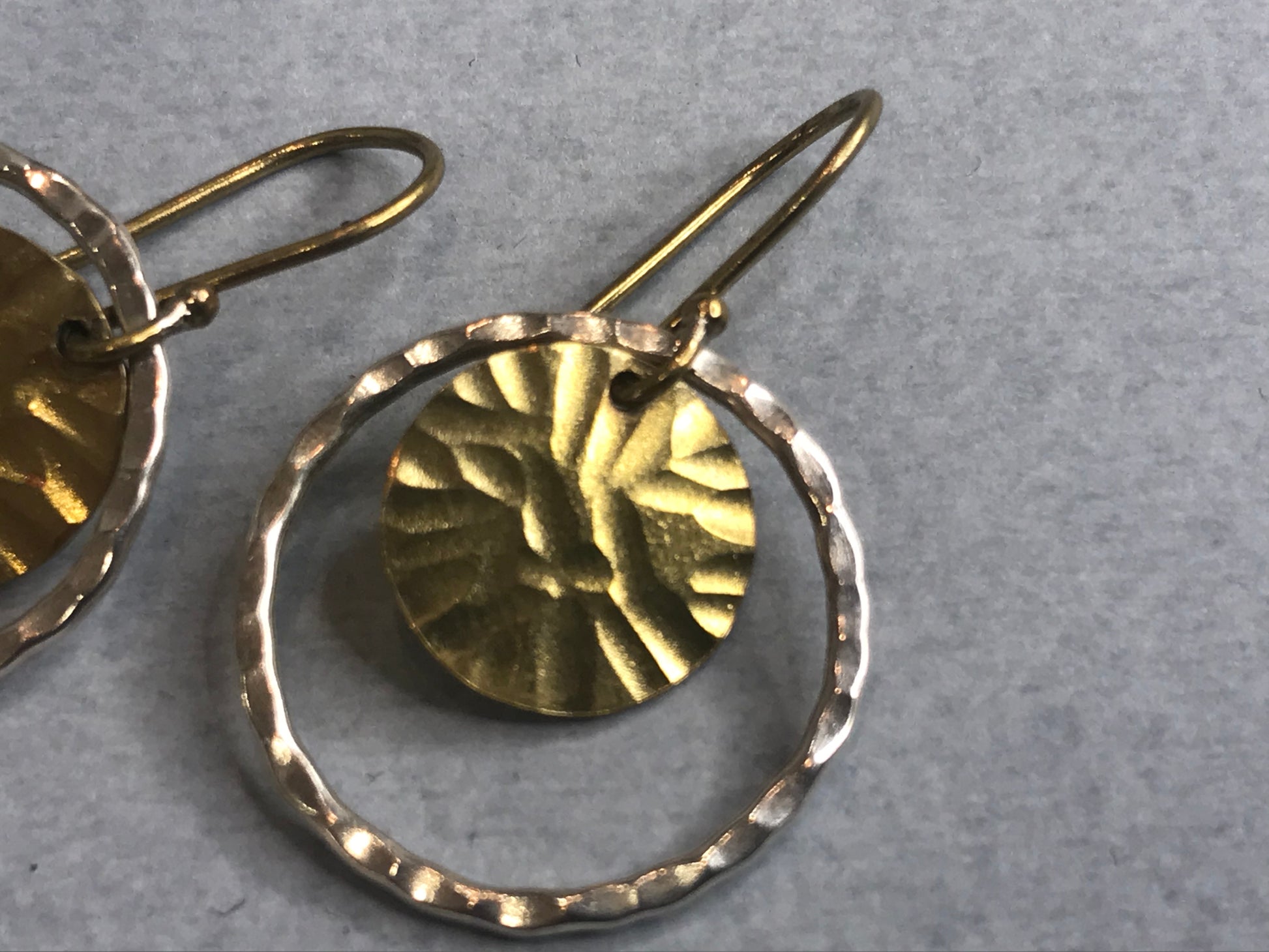 22mm outer sterling silver disc encasing a hammered 9kt gold disc.