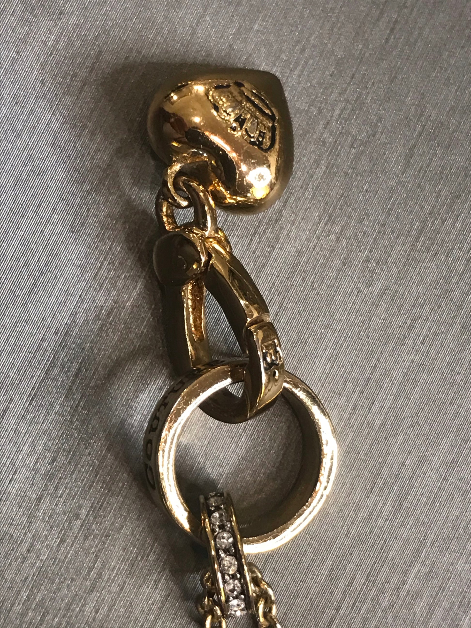 It falls to just the right length and has the lovely details (a sparkling crystal ring, a gleaming gold heart, inter-connecting gold rings, the crown insignia both on the necklace and hanging down from the clasp....) that make it something more than just 'another gold necklace'.