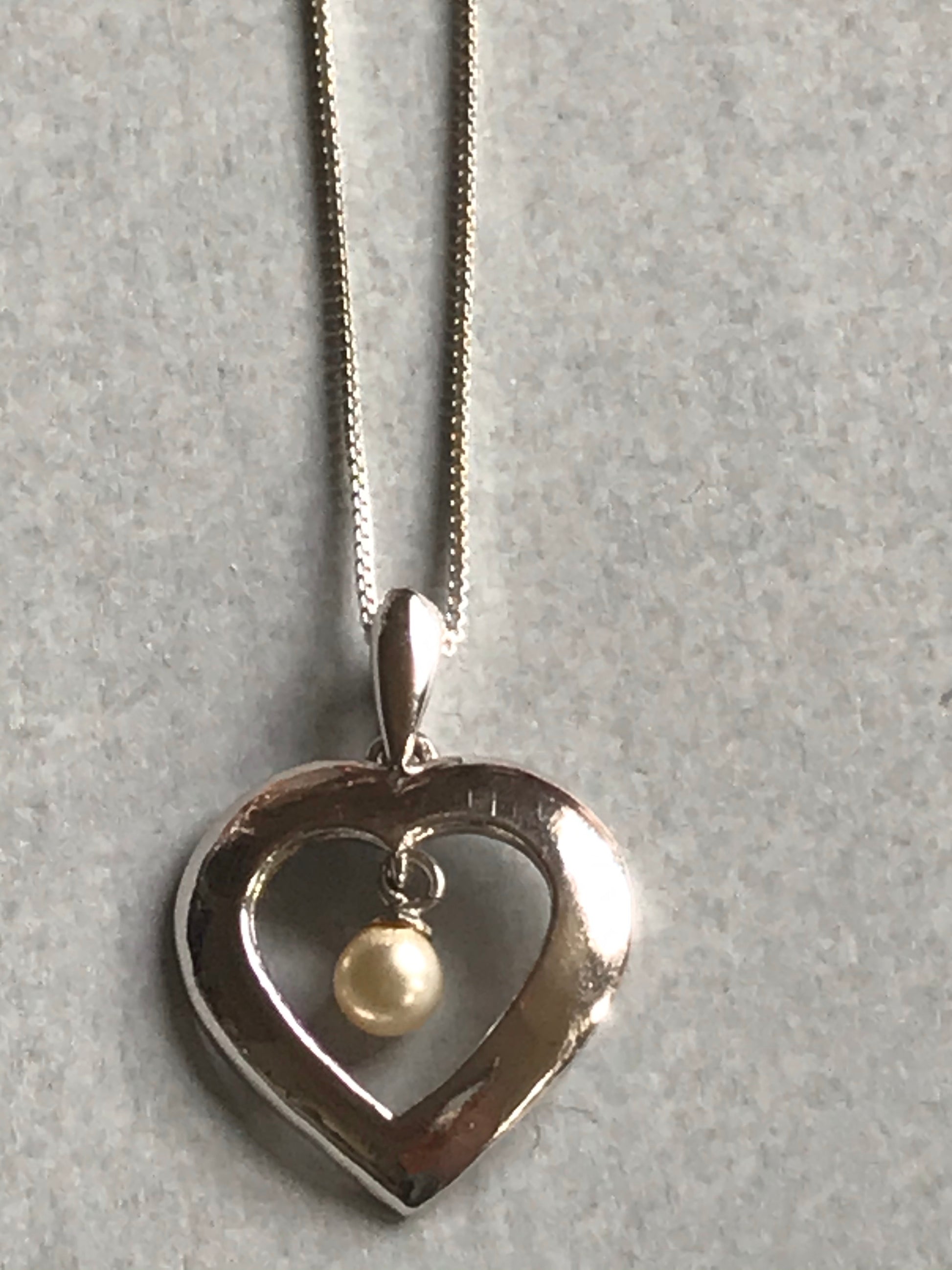 A glorious real silver love heart with a stunning creamy pearl delicately dangling in the centre. Classic, elegant and unique.